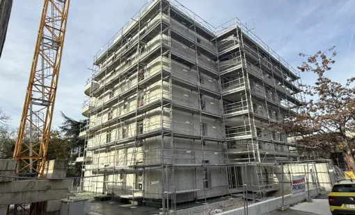 Le chantier débute avec le montage de la moitié de l’échafaudage, première étape avant le ravalement complet de cette résidence de 23…